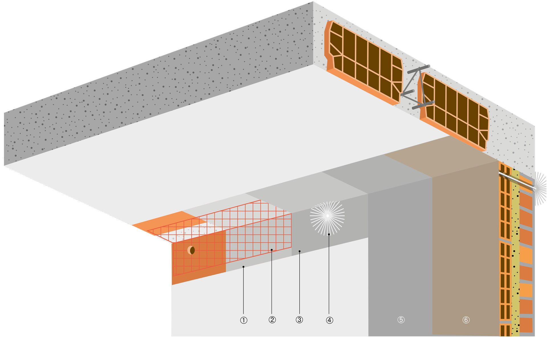 (2) Use the ARMAGLASS STRUCTURA 250 mesh, or alternatively ARMAGLASS STRUCTURA 115 according to the design indications (usually ARMAGLASS STRUCTURA 250 is used in the perimeter cladding and ARMAGLASS STRUCTURA 115 in the internal partition walls).